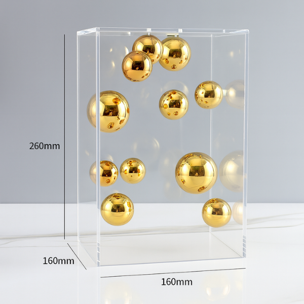 Com design minimalista em formato de cubo com esfera interna, em acabamento acrílico dourado, ele é o detalhe perfeito para dar destaque à decoração de quartos infantis, salas de brincar ou até mesmo espaços de leitura.