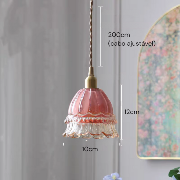 Feita com materiais de alta qualidade, a estrutura em ferro e cobre confere resistência, enquanto o vidro colorido — disponível nas cores bege e rosa — adiciona um toque artístico e aconchegante. Com fio ajustável de até 2 metros, adapta-se facilmente a diferentes alturas e estilos de espaço.